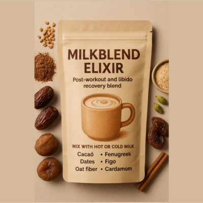 MilkBlend Elixir: A rich, restorative blend crafted for post-workout recovery and enhanced libido. Designed to mix seamlessly with hot or cold milk, this nourishing elixir combines energizing cacao, hormone-supporting fenugreek, mineral-rich dates and figs, gut-friendly oat fiber, and aromatic cardamom—bringing comfort, vitality, and indulgence to every sip.